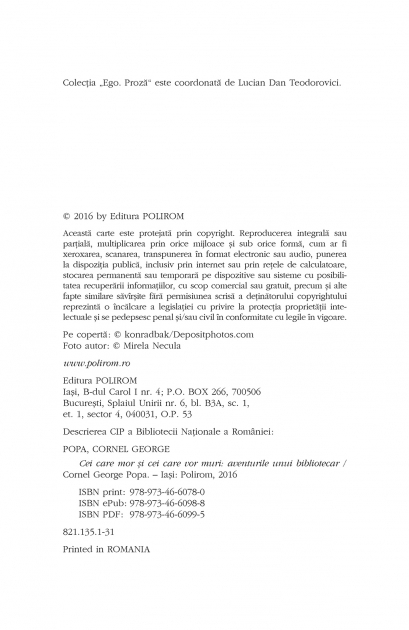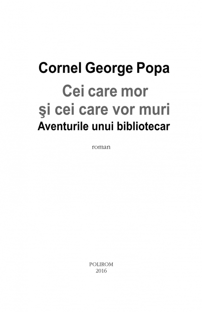 Comandă online Cei care mor şi cei care vor muri. Aventurile unui bibliotecar la 28,50 lei isbn 9789734660780 scrisă de Cornel George Popa, tiparită la editura Polirom face parte din colecția Ego. Proza. Cartea poate fi livrată în circa 5 zile cu plata ramburs sau online cu cardul.