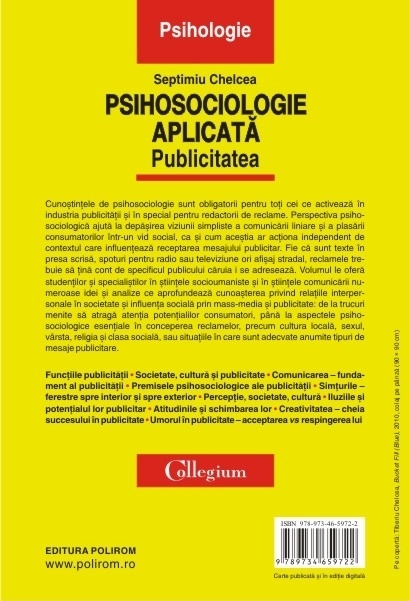 Psihologie. cu plata ramburs sau online cu cardul. Momentan titlul "Psihosociologie aplicată. Publicitatea" nu este disponibil însa vă puteți înscrie pentru a fi notificat în momenul reaprovizionarii.">