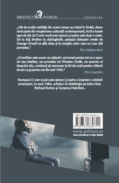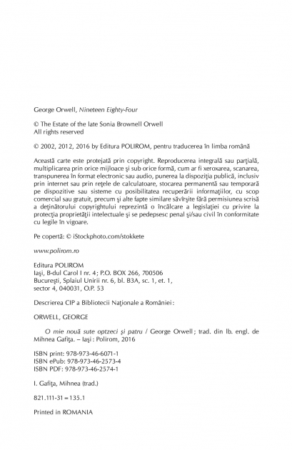 Traducere din limba engleza de Mihnea Gafita Romanul O mie noua sute optzeci si patru a inspirat o celebra ecranizare, in anul 1984, avindu-i in distributie pe John Hurt, Richard Burton si Suzanna Hamilton. Winston Smith este un personaj obisnuit: el uraste, iubeste si munceste ca oricare alt om. Ceea ce-l face deosebit este faptul ca traieste intr-o lume infernala, in care a uri, a iubi sau a munci sint ginduri venite dintr-un efort supraomenesc al fiecarei clipe. Romanul O mie noua sute optzeci si patru descrie tabloul apocaliptic al unei Londre din era postatomica, locul de nastere al unui regim totalitar in care orice logica pare sa fi fost abolita. Executiile fara rost, disparitiile peste noapte au devenit firesti. Trecutul este rescris mereu pentru a legitima crimele prezentului, iar instrumentul propagandei este odioasa „nouvorba”, o limba robotizata, care completeaza imaginea de lume ordonata „stiintific” dupa vointa Fratelui cel Mare, care spune ca „razboiul este pace, libertatea este sclavie, ignoranta este putere”. „Atit de multe realitati din acest roman au intrat in limba, devenind parte din mostenirea culturala contemporana, incit e foarte usor sa uiti ca O mie noua sute optzeci si patru este doar o carte. De la Big Brother la dublugindit, peisajul distopiei create de George Orwell se afla chiar si in mintile celor care nu i-au citit povestea.” (The Independent) „Orwellian este acum un adjectiv universal pentru tot ce e opresiv sau totalitar, iar povestea lui Winston Smith, un anonim al timpului sau, continua sa rezoneze la fel de mult pentru cititorii de azi ca si pentru cei din anii 1950.” (The Guardian)Comandă online O mie nouă sute optzeci și patru la 36,90 lei isbn 9789734660711 scrisă de George Orwell, tiparită la editura Polirom face parte din colecția BIBLIOTECA POLIROM -> Esential. cu plata ramburs sau online cu cardul. Momentan titlul O mie nouă sute optzeci și patru nu este disponibil însa vă puteți înscrie pentru a fi notificat în momenul reaprovizionarii.