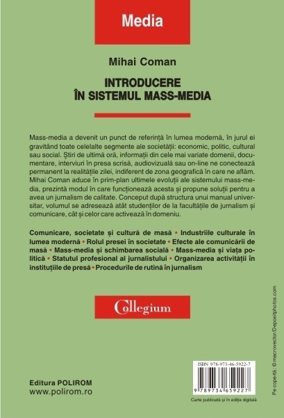Editia a IV-a revazuta si adaugita Mass-media a devenit un punct de referinta in lumea moderna, in jurul ei gravitind toate celelalte segmente ale societatii: economic, politic, cultural sau social. Stiri de ultima ora, informatii din cele mai variate domenii, documentare, interviuri in presa scrisa, audiovizuala sau on-line ne conecteaza permanent la realitatile zilei, indiferent de zona geografica in care ne aflam. Mihai Coman aduce in prim-plan ultimele evolutii ale sistemului mass-media, prezinta modul in care functioneaza acesta si propune solutii pentru a avea un jurnalism de calitate. Conceput dupa structura unui manual universitar, volumul se adreseaza atit studentilor de la facultatile de jurnalism si comunicare, cit si celor care activeaza in domeniu. Din cuprins: Comunicare, societate si cultura de masa • Industriile culturale in lumea moderna • Rolul presei in societate • Efecte ale comunicarii de masa • Mass-media si schimbarea sociala • Mass-media si viata politica • Statutul profesional al jurnalistului • Organizarea activitatii in institutiile de presa • Procedurile de rutina in jurnalism