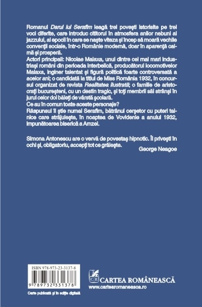 Romanul Darul lui Serafim leaga trei povesti istorisite pe trei voci diferite, care introduc cititorul in atmosfera anilor nebuni ai jazzului, ai epocii in care se naste viteza si incep sa moara vechile conventii sociale, intr-o Romanie moderna, doar in aparenta calma si prospera.