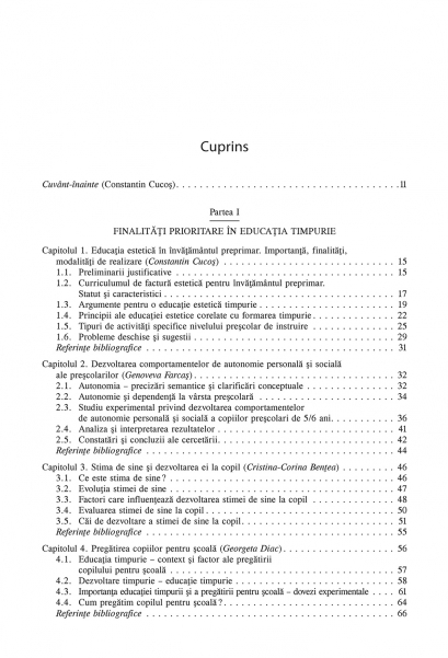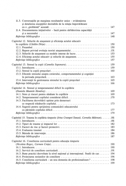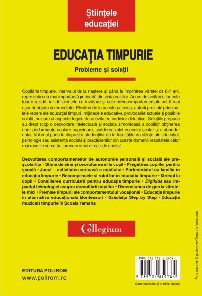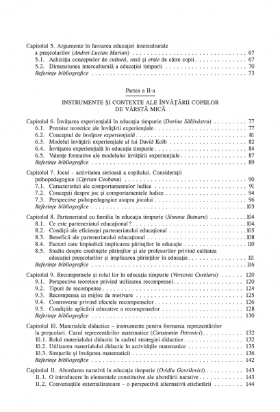 Copilaria timpurie, intervalul de la nastere si pina la implinirea virstei de 6-7 ani, reprezinta cea mai importanta perioada din viata copiilor. Acum dezvoltarea lor este foarte rapida, iar deficientele de invatare si cele psihocomportamentale pot fi mai usor depistate si remediate. Plecind de la aceste premise, autorii prezinta principalele repere ale educatiei timpurii, mijloacele educative, provocarile actuale si posibile solutii, precum si aspecte legate de activitatea cadrelor didactice. Solutiile propuse au drept scop o dezvoltare intelectuala si sociala armonioasa a copiilor, obtinerea unor performante scolare superioare, scaderea ratei esecului scolar si a abandonului. Volumul pune la dispozitia studentilor de la facultatile de stiinte ale educatiei, psihologie sau asistenta sociala si practicienilor din aceste domenii rezultatele celor mai recente cercetari, precum si noi directii de analiza.