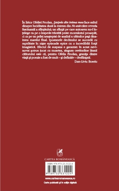 Ofelia Prodan cunoaste vechea legenda orientala care spune ca la fiecare intersectie dintr-un oras parasit se string demonii si il asteapta pe calatorul strain care se incumeta sa treaca pe acolo, pentru a-i tulbura mintile. Din fiecare pagina a Sarpelui din inima mea se iveste o noua fata a celui care te ispiteste si te conduce printre demonii din carte, incit nu stii prea bine daca te vei rataci sau vei ajunge in final la o destinatie. Ajungi, dar nu mai esti tu! „Am vrut si n-am vrut sa scriu Sarpele din inima mea. Fiecare poem a fost ca o incizie in craniu, dezvelind o parte bolnava din creier. Nebunia imi dadea lacoma tircoale in fiecare noapte si, terifiata, spuneam «Stop!». Si totusi, continuam, cu o luciditate sinucigasa, a doua zi, sfidind orice. Trebuie scrisa cartea aceasta, imi soptea perfid vocea interioara. Am scris-o si in final am zis: «Sarpele din inima mea imi codifica o parte din viata si e foarte bine asa!».” (Ofelia Prodan) „In lirica Ofeliei Prodan, Sarpele din inima mea face saltul dinspre luciditatea dusa la extrem din No exit catre reveria fascinanta a sfirsitului; un sfirsit pe care autoarea nu-l intelege ca pe o lespede trintita peste mormintul proaspat, ci ca pe un prilej neasteptat de analiza a ultimilor pasi dinaintea marelui final. Ipostazele declinului se succeda cu rapiditate in niste episoade epice cu o incredibila forta imagistica. Efectul de suspans e garantat: in acest nevinovat sotron jucat cu moartea, singura certitudine lasata cititorului este ca, pentru Ofelia Prodan, granita dintre viata si poezie a fost de mult – si definitiv – desfiintata.” (Dan-Liviu Boeriu)