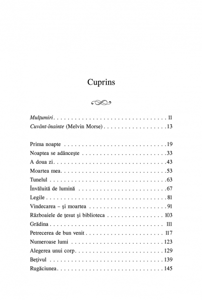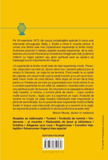 Cuvint‑inainte de Melvin Morse Traducere de Cristian Hanu Bestseller New York Times Cea mai profunda si completa experienta la limita mortii Pe 18 noiembrie 1973, din cauza complicatiilor aparute in urma unei interventii chirurgicale, Betty J. Eadie a intrat in moarte clinica. A urmat una dintre cele mai coplesitoare experiente la limita mortii. Autoarea prezinta in detaliu etapele acestei experiente, de la strabaterea unui tunel intunecat si revederea intregii sale vieti si pina la intilniri cu ingeri pazitori sau ghizi spirituali care au ajutat-o sa inteleaga lucruri importante din viata ei. „O experienta la limita mortii este de fapt experienta mortii. Personal, obisnuiam sa cred ca, atunci cind mor, oamenii patrund pur si simplu in intuneric, iar viata lor se termina. Fiind medic la un spital de urgenta, am vazut multi copii si adulti murind, si nu am avut niciodata vreun motiv sa cred altceva. Abia dupa ce mi-am facut timp pentru a-i intreba pe cei care au supravietuit unor morti clinice in ce a constat experienta lor am aflat ca, adeseori, moartea este un proces spiritual si plin de bucurie. Nu intunericul ne asteapta la sfirsitul vietii noastre, ci lumina, o lumina plina de iubire – «care contine multe lucruri bune», dupa cum s-a exprimat un copil. Invaluita de lumina ne invata ca viata noastra individuala este importanta si plina de semnificatie. Ea nu prezinta doar experienta mortii lui Betty Eadie in timpul unei interventii chirurgicale si a revenirii ei la viata; ea reprezinta practic o calatorie in sensul profund al acestei vieti.” (Melvin Morse, doctor in medicina) Din cuprins: Noaptea se adinceste • Tunelul • Invaluita de lumina • Vindecarea – si moartea • Razboaiele de tesut si biblioteca • Gradina • Alegerea unui corp • Rugaciunea • Consiliul inteleptilor • Intoarcerea • Ingerul meu special