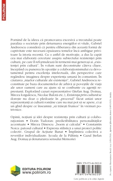 Pornind de la ideea ca promovarea excesiva a trecutului poate paraliza o societate prin deturnarea energiilor ei vitale, Gabriel Andreescu considera ca pentru eliberarea din aceasta forma de captivitate este necesara epuizarea temelor inca ambigue privitoare la istoria recenta. Cu o astfel de motivatie, a dus la capat cea mai elaborata cercetare asupra subiectului rezistentei prin cultura, pe care il reformuleaza in termenii mai generosi ai „existentei prin cultura”. In volum sint deconstruite citeva clisee, incepind cu punerea in opozitie a colaborationismului cu devotamentul pentru excelenta intelectuala, din perspective care regindesc imaginea despre experienta umana in comunism. In cautarea „niselor culturale ale existentei”, Gabriel Andreescu reconstituie pe baza documentelor de arhiva si povestile de viata ale unor oameni care au ajuns sa se confrunte cu agentii represiunii. Explorind cazuri reprezentative (Stefan Aug. Doinas, Mircea Iorgulescu, Nicolae Balota etc.), Existenta prin cultura se doreste nu doar o pledoarie in „procesul” facut astazi unor reprezentanti ai culturii romane care nu mai pot sa se apere, ci si un ghid despre ce inseamna „sa traiesti frumos” in vremuri potrivnice.
