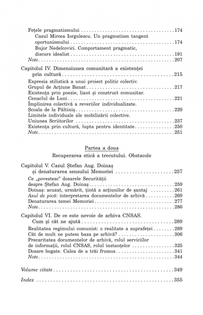 Opinii, notiuni si idei despre rezistenta prin cultura si colaborationism • Dorin Tudoran: predictibilitatea personalitatilor accentuate • Mircea Dinescu: „boem si calculat” • Constantin Noica: patosul cultural • Expresia stilistica a unui proiect politic colectiv. Grupul de Actiune Banat • Implinirea colectiva a reveriilor individualizate. Scoala de la Paltinis • Cazul Stefan Aug. Doinas si denaturarea sensului Memoriei