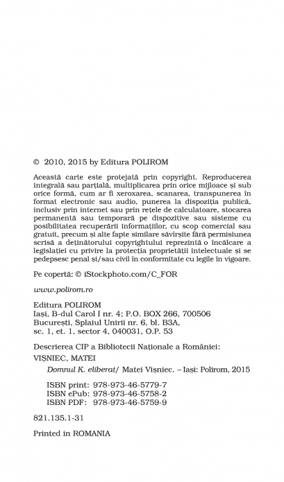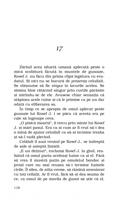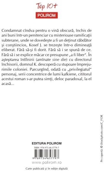Condamnat cindva pentru o vina obscura, inchis de ani buni intr-un penitenciar cu misterioase ramificatii subterane, unde se dovedeste a fi un detinut rabdator si constiincios, Kosef J. se trezeste intr-o dimineata eliberat. Fara sa-si fi dorit. Fara sa i se spuna de ce. Fara sa i se explice macar ce presupune „a fi liber”. In asteptarea intilnirii (aminate sine die) cu directorul inchisorii, domnul K. descopera cu stupoare imprejurimile coloniei. Parcurgind, odata cu „privilegiatul” personaj, serii concentrice de lumi kafkiene, cititorul acestui roman s-ar putea simti, deloc paradoxal, la el acasa...