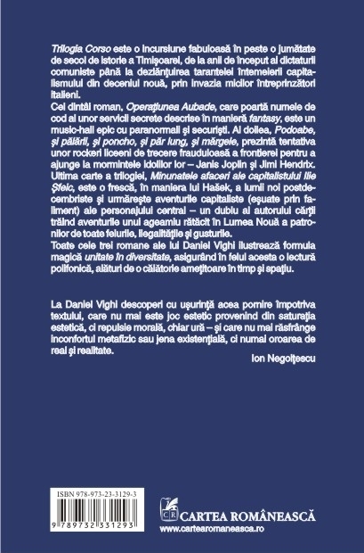 Trilogia Corso este o incursiune fabuloasa in peste o jumatate de secol de istorie a Timisoarei, de la anii de inceput ai dictaturii comuniste pina la dezlantuirea tarantelei intemeierii capitalismului din deceniul noua, prin invazia micilor intreprinzatori italieni.