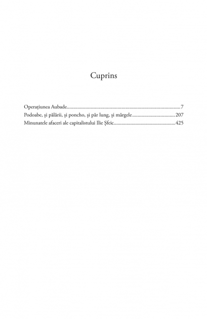 Cel dintii roman, Operatiunea Aubade, care poarta numele de cod al unor servicii secrete descrise in maniera fantasy, este un music-hall epic cu paranormali si securisti. Al doilea, Podoabe, si palarii, si poncho, si par lung, si margele, prezinta tentativa unor rockeri liceeni de trecere frauduloasa a frontierei pentru a ajunge la mormintele idolilor lor – Janis Joplin si Jimi Hendrix. Ultima carte a trilogiei, Minunatele afaceri ale capitalistului Ilie Sfeic, este o fresca, in maniera lui Hašek, a lumii noi postdecembriste si urmareste aventurile capitaliste (esuate prin faliment) ale personajului central – un dublu al autorului cartii traind aventurile unui ageamiu ratacit in Lumea Noua a patronilor de toate felurile, ilegalitatile si gusturile.