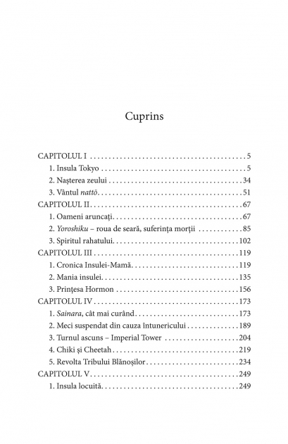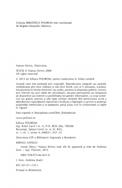Traducere din limba japoneza si note de Andreea Sion Roman distins in anul aparitiei cu Premiul Junichiro Tanizaki si ecranizat, in 2010, in regia lui Makoto Shinozaki, intr-o productie cu actrita Tae Kimura in rolul principal Citeva zeci de naufragiati japonezi isi gasesc pe rind refugiul pe o insula din largul Filipinelor. Kiyoko, singura femeie din tot grupul, ajunge acolo printre primii, alaturi de sotul ei, care dispare insa curind. Aflata la mijlocul vietii, Kiyoko devine obiectul dorintelor tuturor celorlalti naufragiati si isi intra repede in rolul de femeie fatala: pe rind, fiecare sot (obtinut prin tragere la sorti!) isi gaseste moartea in conditii misterioase. Pe insula apare si un al doilea grup de naufragiati, al chinezilor, care se dovedesc a fi foarte practici si inventivi, ajungind sa-si creeze din resturile de pe insula un sistem de supravietuire ingenios, in timp ce japonezii isi risipesc energia cu obiecte artizanale decorate fantezist si cu alte lucruri la fel de fara rost. In scurt timp, cele doua clanuri incep sa nu se mai inteleaga; nu e greu de priceput ca rivalitatile lor nu sint doar economice… In aceasta alegorie à la Daniel Defoe, Natsuo Kirino urmareste cu exactitate aproape mecanica raporturile de forte ce se nasc intr-o comunitate inchisa; ea reuseste sa jongleze admirabil cu umorul si cruzimea, fara sa piarda din vedere tema principala a romanului: locul femeii japoneze in contemporaneitate. „Kiyoko si-a scos rochia neagra si zdrentuita. Goala, a intrat in mare… «Azi joc rolul principal si trebuie sa fiu frumoasa», si-a spus, zimbind fara voie. Intotdeauna si oriunde s-ar fi aflat, avea rolul principal. Pe insula era in centrul atentiei si toti se intreceau sa-i intre in gratii… Dintre cei treizeci si doi de locuitori ai insulei, ea era singura femeie... Cite lupte pe viata si pe moarte nu se dadusera pentru ea, cea de acum? I-a venit din nou sa zimbeasca. Oare cite femei, pe lumea asta, erau la fel de dorite de barbati precum era ea?” „Insula Tokyo este o proza ambitioasa: are scriitura sigura si o foarte usor de simtit (si de apreciat) forta de a tine cititorul in alerta. Supravietuirea este legata mereu, in roman, de putere, de luptele pentru a o pastra – ceea ce nu suna prea strain pentru nimeni.” (k-libre.fr)