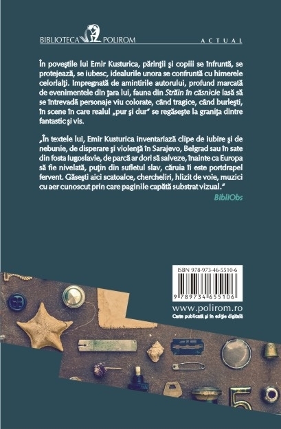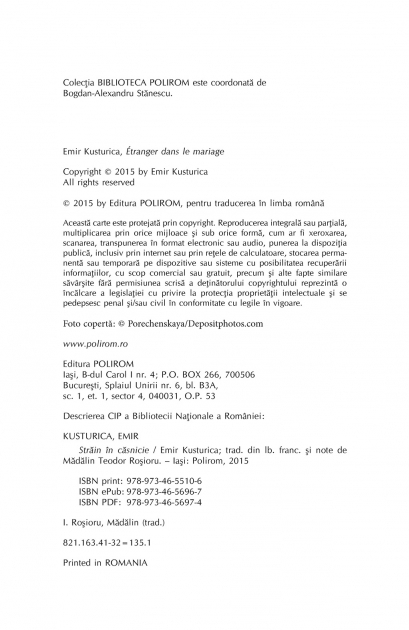 Traducere din limba franceza si note de Madalin Rosioru O monografie a cuplului in scurtmetraje pline de umor si compasiune Avind drept fundal Bosnia-Hertegovina anilor ’70, inainte de destramarea Iugoslaviei, spatiu in care domneste influenta partidului, povestirile lui Emir Kusturica descriu viata a trei tineri, Dragan, Aleksa si Kosta. Inspirindu-se din realul marunt, Strain in casnicie este o colectie de istorii cu teme dintre cele mai obisnuite: povesti de familie, in care parintii si copiii intra inevitabil in conflict, povesti de dragoste, uneori imposibile, povesti in care tinerii se maturizeaza si incearca sa depaseasca granitele lumii „de acasa”. De la iubirea adolescentina la cea matura, care conduce spre mariaj, cu dramele si neintelegerile lui, monografia cuplului se consuma in scurtmetraje pline de umor si de compasiune, iar spectatorii lui Kusturica-regizorul vor recunoaste detalii in care fantezia si intunericul coexista, intr-un decor inspirat din realismul magic. In povestile lui Emir Kusturica, parintii si copiii se infrunta, se protejeaza, se iubesc, idealurile unora se confrunta cu himerele celorlalti. Impregnata de amintirile autorului, profund marcata de evenimentele din tara lui, fauna din Strain in casnicie lasa sa se intrevada personaje viu colorate, cind tragice, cind burlesti, in scene in care realul „pur si dur” se regaseste la granita dintre fantastic si vis. „In textele lui, Emir Kusturica inventariaza clipe de iubire si de nebunie, de disperare si violenta in Sarajevo, Belgrad sau in sate din fosta Iugoslavie, de parca ar dori sa salveze, inainte ca Europa sa fie nivelata, putin din sufletul slav, caruia ii este portdrapel fervent. Gasesti aici scatoalce, chercheliri, hlizit de voie, muzici cu aer cunoscut prin care paginile capata substrat vizual.” (BibliObs)