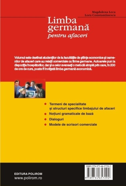 Editia a II-a Volumul este destinat studentilor de la facultatile de stiinte economice si oamenilor de afaceri care au relatii comerciale cu firme germane. Autoarele pun la dispozitia incepatorilor, dar si a celor avansati o metoda simpla prin care, in 200 de ore de curs, poate fi invatata limba germana economica. • Termeni de specialitate si structuri specifice limbajului de afaceri • Notiuni gramaticale de baza • Dialoguri • Modele de scrisori comerciale