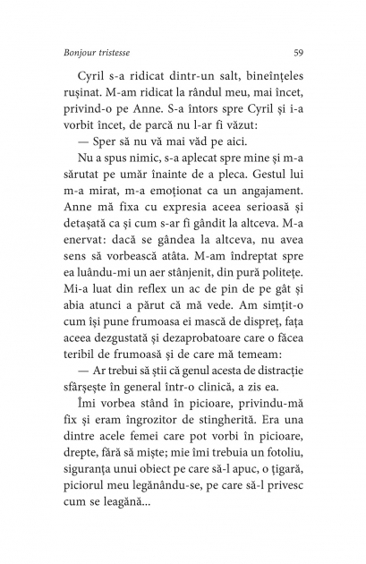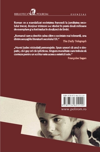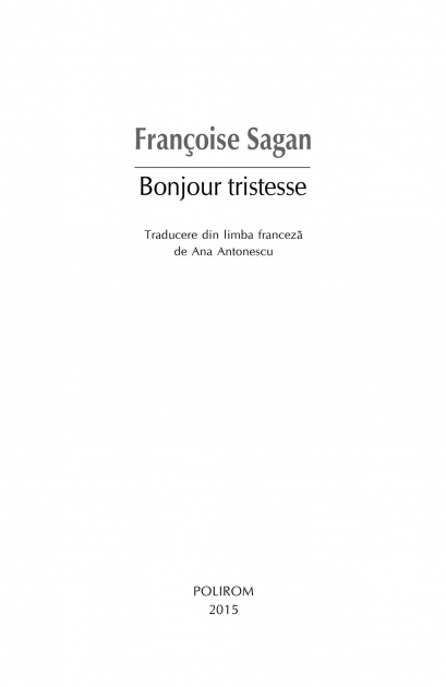 Intr-o noua traducere, de Ana Antonescu Romanul care a rascolit destinele unei generatii. Roman ce a scandalizat societatea franceza la jumatatea secolului trecut, Bonjour tristesse s-a vindut in peste doua milioane de exemplare si a fost tradus in douazeci de limbi. Bonjour tristesse urmareste peripetiile unei adolescente care incearca sa inteleaga si sa controleze lumea din jur. Cecile isi petrece vacanta de vara la tarmul Mediteranei, impreuna cu tatal ei si cu iubita acestuia, Elsa, o tinara frivola, ahtiata dupa viata mondena, cu care fiica se intelege excelent. Dar lucrurile se complica atunci cind in vizita soseste Anne, veche prietena a mamei raposate, o femeie stilata, culta, responsabila, de care tatal ei se indragosteste nebuneste si cu care decide sa se casatoreasca. Desi o admira pe Anne, fata de numai 17 ani isi vede amenintata viata usuratica, palpitanta si voluptuoasa, asa ca tese impreuna cu iubitul ei, Cyril, o intriga amoroasa prin care Anne sa decada in ochii tatalui si Elsa sa revina in viata acestuia. Cartea a fost ecranizata de trei ori, versiunea cea mai cunoscuta fiind cea din 1958, in regia lui Otto Preminger, cu Deborah Kerr, David Niven si Jean Seberg in rolurile principale. „Romanul care a deschis calea catre o societate mai toleranta, una dintre senzatiile literaturii secolului XX.” (The Daily Telegraph) „Nu-mi judec niciodata personajele. Spun uneori ca unul e simpatic, ca-i gay ori ca-i plicticos. Singura moralitate care trebuie sa conteze pentru un scriitor este aceea a esteticii sale.” (Francoise Sagan)