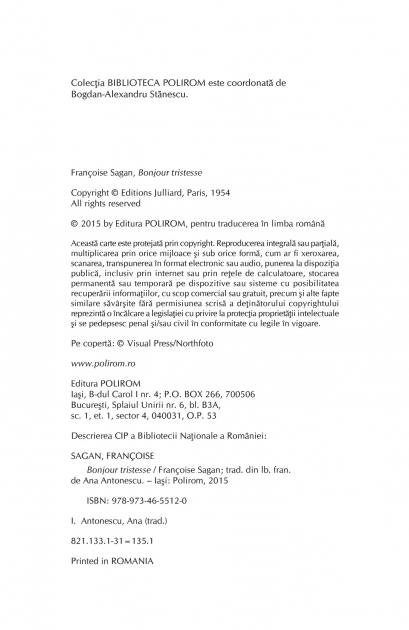 Esential. cu plata ramburs sau online cu cardul. Momentan titlul "Bonjour tristesse" nu este disponibil însa vă puteți înscrie pentru a fi notificat în momenul reaprovizionarii.">