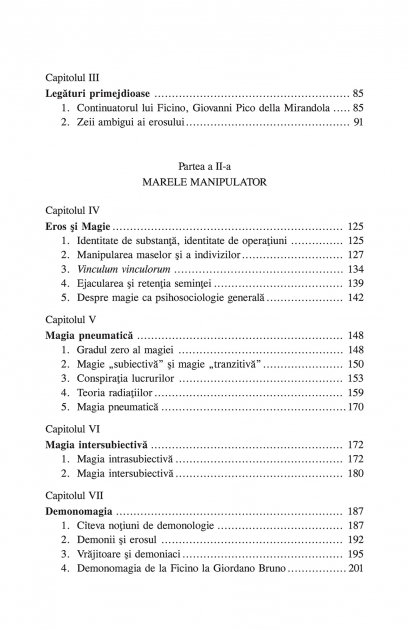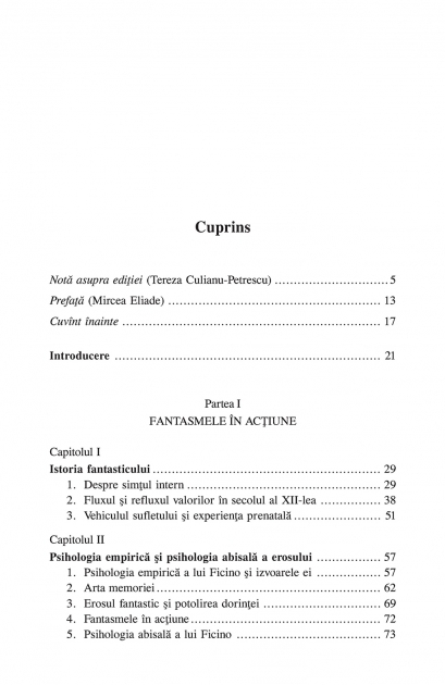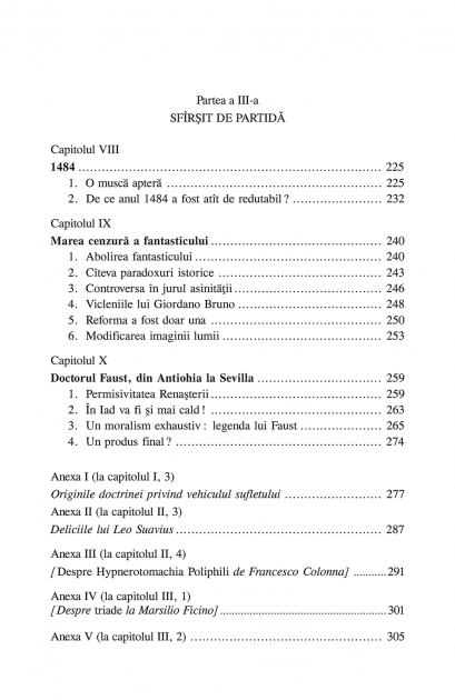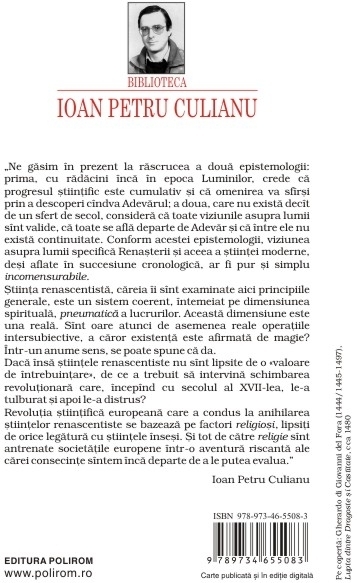 Editia a treia Traducere din limba franceza de Dan Petrescu Prefata de Mircea Eliade Postfata de Sorin Antohi Traducerea textelor din limba latina de Ana Cojan si Ion Acsan „Ne gasim in prezent la rascrucea a doua epistemologii: prima, cu radacini inca in epoca Luminilor, crede ca progresul stiintific este cumulativ si ca omenirea va sfirsi prin a descoperi cindva Adevarul; a doua, care nu exista decit de un sfert de secol, considera ca toate viziunile asupra lumii sint valide, ca toate se afla departe de Adevar si ca intre ele nu exista continuitate. Conform acestei epistemologii, viziunea asupra lumii specifica Renasterii si aceea a stiintei moderne, desi aflate in succesiune cronologica, ar fi pur si simplu incomensurabile. Stiinta renascentista, careia ii sint examinate aici principiile generale, este un sistem coerent, intemeiat pe dimensiunea spirituala, pneumatica a lucrurilor. Aceasta dimensiune este una reala. Sint oare atunci de asemenea reale operatiile intersubiective, a caror existenta este afirmata de magie? Intr-un anume sens, se poate spune ca da. Daca insa stiintele renascentiste nu sint lipsite de o «valoare de intrebuintare», de ce a trebuit sa intervina schimbarea revolutionara care, incepind cu secolul al XVII-lea, le-a tulburat si apoi le-a distrus? Revolutia stiintifica europeana care a condus la anihilarea stiintelor renascentiste se bazeaza pe factori religiosi, lipsiti de orice legatura cu stiintele insesi. Si tot de catre religie sint antrenate societatile europene intr-o aventura riscanta ale carei consecinte sintem inca departe de a le putea evalua.” (Ioan Petru Culianu)