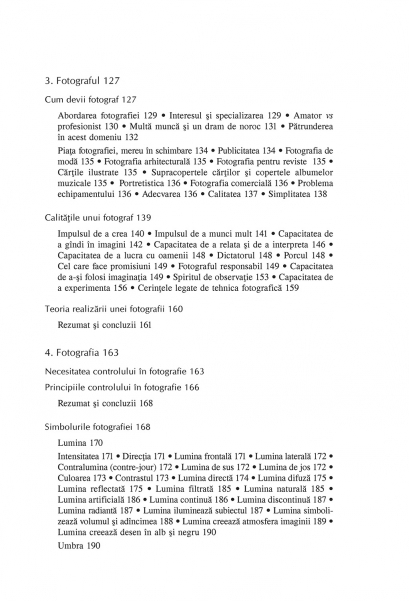 Traducere din limba engleza de Ioana Aneci Oricine poate sa faca o fotografie draguta, dar, pentru ca aceasta sa fie buna, cel care apasa declansatorul trebuie sa stapineasca foarte bine tehnica fotografica si principiile compozitiei. Iar pentru a crea opere de arta este nevoie de mult mai mult – de la talent nativ, simt estetic si creativitate, pina la disponibilitate pentru efort prelungit si o buna capacitate de observare a mediului inconjurator. Andreas Feininger isi sintetizeaza experienta in domeniul fotografiei, oferind sfaturi utile cu privire in special la fotografia alb-negru, care de multe ori este mai expresiva si are un impact mai mare decit cea color. Profesionistii si toti cei interesati sa-si descopere si sa-si cultive talentul pentru arta fotografica gasesc in aceasta carte informatii utile si solutii ingenioase care se pot aplica in diferite situatii.