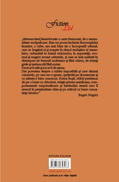 „Manuscrisul fanariot este o carte fastuoasa, de o senzualitate molipsitoare. Este un poem inchinat Bucurestiului fanariot, o urbe, sau mai bine zis o incropeala urbana, care se leagana zi si noapte in ritmul molesitor al manelelor, cufundata in fumul ciubucelor, in superstitii, zvonuri si magice arome orientale, si care se lasa asaltata in rastimpuri de frenezii endemice si fara obiect, de tristeti grele si melancolii fara nume. Daca ar fi atit si tot ar fi de-ajuns. Dar povestea despre o iubire imposibila si care sfarma cutumele, pe care ne-o spune, sprijinita pe documente si cu talentu-i bine cunoscut, Doina Rusti, ridica perdeaua de pe o lume cu obiceiuri, relatii private nemiloase, comportamente surprinzatoare si habitudini stranii care il arunca in perplexitate chiar si pe criticul cu bune cunostinte istorice.” (Eugen Negrici)