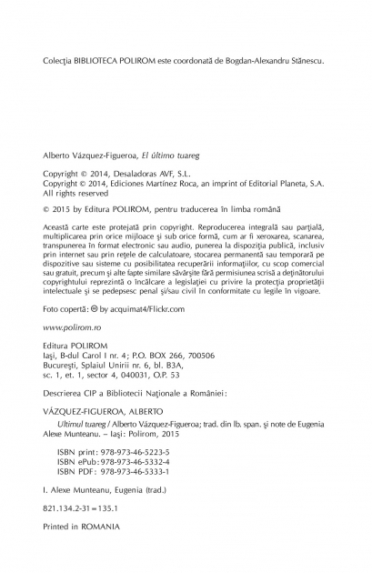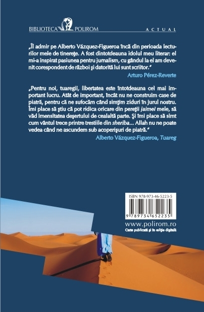 Traducere din limba spaniola si note de Eugenia Alexe Munteanu La mai bine de trei decenii de la publicarea bestsellerului Tuareg, Alberto Vazquez-Figueroa revine asupra temei care l-a impus drept unul dintre cei mai cunoscuti scriitori spanioli contemporani: miticul Popor al Valului si lupta sa pentru a-si apara traditiile, in inima unui desert pe care incep sa si-l dispute tot mai multe forte. De data aceasta amenintarea vine din interior, din partea islamistilor radicali, tot mai puternici si mai violenti, care seamana haos si teroare printre occidentali si popoarele din desert si arunca anatema asupra slujitorilor lui Allah. Ca sa-si salveze onoarea si sa-i pedepseasca pe cei care le pervertesc religia, liderii tuaregi hotarasc sa-i vineze si sa-i lichideze pe jihadisti. Printre salvatorii credintei lor se numara, neasteptat, si un umil sofer de camion, Gacel Mugtar, care cunoaste desertul ca-n palma. Insa el nu va avea de luptat doar cu un dusman atroce si intreaga lui retea subterana de fanatici si mercenari, ci mai ales cu tenebrele propriei constiinte. „Il admir pe Alberto Vazquez-Figueroa inca din perioada lecturilor mele de tinerete. A fost dintotdeauna idolul meu literar: el mi-a inspirat pasiunea pentru jurnalism, cu gindul la el am devenit corespondent de razboi si datorita lui sunt scriitor.” (Arturo Perez-Reverte) „Pentru noi, tuaregii, libertatea este intotdeauna cel mai important lucru. Atit de important, incit nu ne construim case de piatra, pentru ca ne sufocam cind simtim ziduri in jurul nostru. Imi place sa stiu ca pot ridica oricare din peretii jaimei mele, sa vad imensitatea desertului de cealalta parte. Si imi place sa simt cum vintul trece printre trestiile din sheriba... Allah nu ne poate vedea cind ne ascundem sub acoperisuri de piatra.” (Alberto Vazquez-Figueroa, Tuareg)