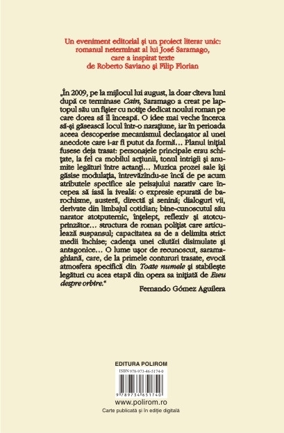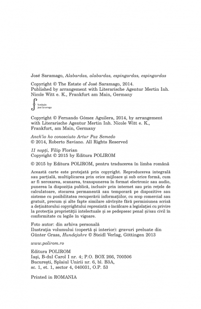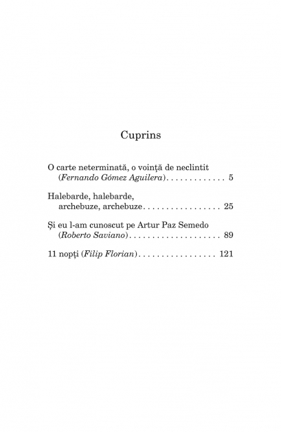 Cu texte de Roberto Saviano si Filip Florian Traducere de Simina Popa, Cerasela Barbone, Corina Nutu Prefata de Fernando Gomez Aguilera Ilustratii de Gunter Grass Un eveniment editorial si un proiect literar unic: romanul neterminat al lui Jose Saramago, care a inspirat texte de Roberto Saviano si Filip Florian „Am citit acum ceva vreme, nu mai stiu exact unde, nici cind, despre un caz identic petrecut in timpul aceluiasi razboi din spania, cu un obuz care n-a explodat si care avea in el o hirtie pe care scria in portugheza Bomba aceasta nu va exploda.” (Jose Saramago) „In 2009, pe la mijlocul lui august, la doar citeva luni dupa ce terminase Cain, Saramago a creat pe laptopul sau un fisier cu notite dedicat noului roman pe care dorea sa il inceapa. O idee mai veche incerca sa-si gaseasca locul intr-o naratiune, iar in perioada aceea descoperise mecanismul declansator al unei anecdote care i-ar fi putut da forma… Planul initial fusese deja trasat: personajele principale erau schitate, la fel ca mobilul actiunii, tonul intrigii si anumite legaturi intre actanti… Muzica prozei sale isi gasise modulatia, intrevazindu-se inca de pe acum atributele specifice ale peisajului narativ care incepea sa iasa la iveala: o expresie epurata de barochisme, austera, directa si senina; dialoguri vii, derivate din limbajul cotidian; bine-cunoscutul sau narator atotputernic, intelept, reflexiv si atotcuprinzator… structura de roman politist care articuleaza suspansul; capacitatea sa de a delimita strict medii inchise; cadenta unei cautari disimulate si antagonice… O lume usor de recunoscut, saramaghiana, care, de la primele contururi trasate, evoca atmosfera specifica din Toate numele si stabileste legaturi cu acea etapa din opera sa initiata de Eseu despre orbire.” (Fernando Gomez Aguilera) „Barbatul se numeste artur paz semedo si lucreaza de aproape douazeci de ani la serviciile de facturare de armament usor si munitii dintr-o fabrica de armament reputata, cunoscuta sub denumirea legala de producoes belona s.a., un nume pe care, e bine sa lamurim, caci au ramas foarte putini cei pe care ii mai intereseaza asemenea informatii inutile, il purta zeita romana a razboiului.” (Jose Saramago) Volum recomandat de