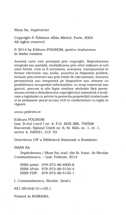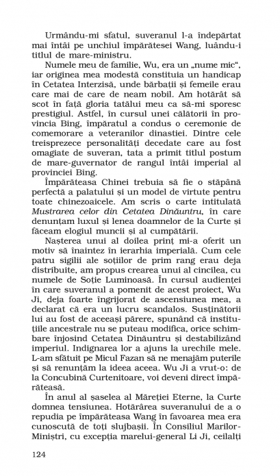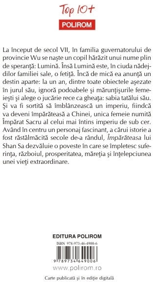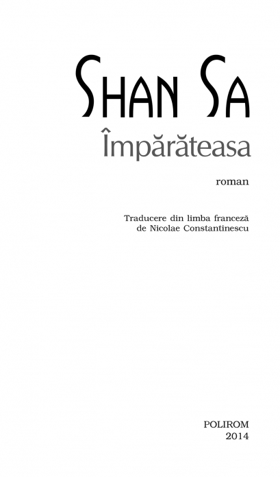 Traducere din limba franceza de Nicolae Constantinescu La inceput de secol VII, in familia guvernatorului de provincie Wu se naste un copil harazit unui nume plin de speranta: Lumina. Insa Lumina este, in ciuda nadejdilor familiei sale, o fetita. Inca de mica ea anunta un destin aparte: la un an, dintre toate obiectele asezate in jurul sau, ignora podoabele si maruntisurile femeiesti si alege o jucarie rece ca gheata: sabia tatalui sau. Si va fi sortita sa imblinzeasca un imperiu, fiindca va deveni imparateasa a Chinei, unica femeie numita Imparat Sacru al celui mai intins imperiu de sub cer. Avind in centru un personaj fascinant, a carui istorie a fost rastalmacita secole de-a rindul, Imparateasa lui Shan Sa dezvaluie o poveste in care se impletesc suferinta, razboiul, prosperitatea, maretia si intelepciunea unei vieti extraordinare.