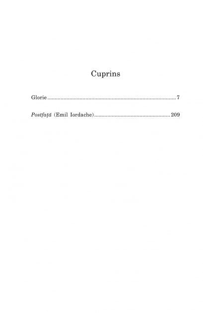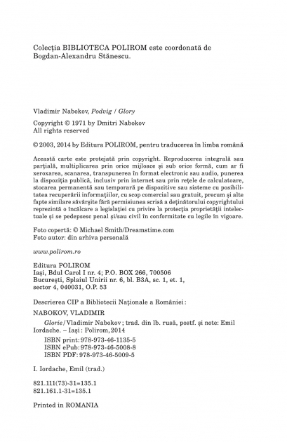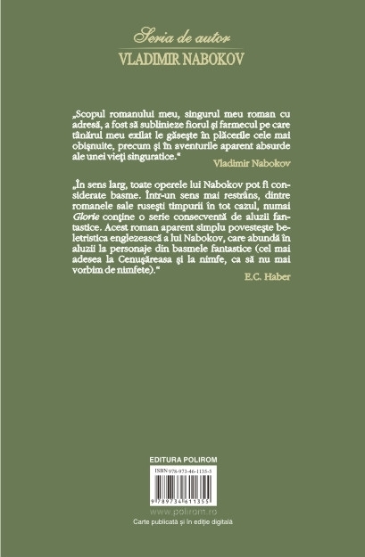Traducere din limba rusa, postfata si note de Emil Iordache „Scopul romanului meu, singurul meu roman cu adresa, a fost sa sublinieze fiorul si farmecul pe care tinarul meu exilat le gaseste in placerile cele mai obisnuite, precum si in aventurile aparent absurde ale unei vieti singuratice.” (Vladimir Nabokov) „In sens larg, toate operele lui Nabokov pot fi considerate basme. Intr-un sens mai restrins, dintre romanele sale rusesti timpurii in tot cazul, numai Glorie contine o serie consecventa de aluzii fantastice. Acest roman aparent simplu povesteste beletristica englezeasca a lui Nabokov, care abunda in aluzii la personaje din basmele fantastice (cel mai adesea la Cenusareasa si la nimfe, ca sa nu mai vorbim de nimfete).” (E.C. Haber)