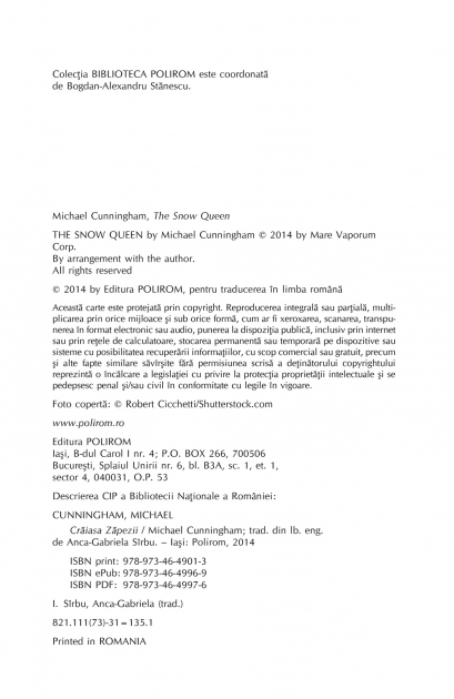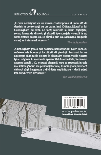 Traducere din limba engleza de Anca‑Gabriela Sirbu Intr-o seara de noiembrie din 2004, intorcindu-se acasa prin Central Park, Barrett Meeks – un gay trecut de prima tinerete, chinuit de o durere cumplita de dinti si de tristetea despartirii de iubitul lui – are o viziune stranie. O lumina coborita din cer i se arata pentru citeva clipe ca o fiinta de basm care-l priveste ca si cum i-ar percepe existenta. Aceasta viziune de o limpezime ireala, ce da nastere la nesfirsite indoieli, interpretari, sperante si asteptari, va schimba imperceptibil viata tuturor personajelor din cercul lui Barrett. Craiasa Zapezii surprinde, cu fantezie si subtilitate, cautarea transcendentului prin orice mijloace – muzica, droguri, iubire, misticism –, intr-un New York magic, acoperit de zapada, desprins parca din basmul lui Andersen. „E ceva neobisnuit ca un roman contemporan sa intre atit de deschis in consonanta cu un basm, insa Craiasa Zapezii al lui Cunningham nu ezita s-o faca; referirile la lacuri inghetate, somn, lumea de dincolo si zapada (personajele viseaza la ea, scriu cintece despre ea, se plimba prin ea, aseamana drogurile cu ea) se insinueaza obsesiv.” (The Independent) „Cunningham tese o oda dedicata nemuritorului New York, cu sufletele sale boeme si locuitorii sai pierduti. Romanul lui ne aminteste ca miturile pe care le plasmuim despre vietile noastre isi au originea in momente aparent fara insemnatate, in oameni aparent banali… Cu o proza eleganta, care se strecoara in cele mai intime ginduri ale personajelor sale, Cunningham provoaca cititorul sa-si imagineze o divinitate nepasatoare – daca exista intr-adevar vreo divinitate.” (The Washington Post) Carte recomandata de
