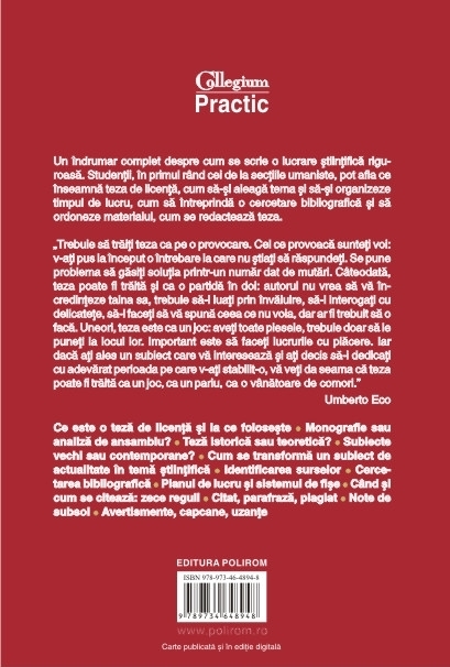 Un indrumar complet despre cum se scrie o lucrare stiintifica riguroasa. Studentii, in primul rind cei de la sectiile umaniste, pot afla ce inseamna teza de licenta, cum sa-si aleaga tema si sa-si organizeze timpul de lucru, cum sa intreprinda o cercetare bibliografica si sa ordoneze materialul, cum se redacteaza teza.
