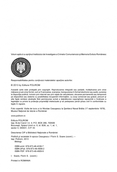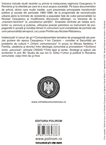 Volumul include studii recente cu privire la instaurarea regimului Ceausescu in Romania si la efectele pe care le-a avut asupra societatii. Pe baza documentelor de arhiva, dintre care multe inedite, sint prezentate principalele transformari politice si sociale din perioada 1965-1989, de la programele de reconstructie urbana pina la formele de rezistenta a populatiei fata de cultul personalitatii lui Nicolae Ceausescu si modificarea discursului ideologic, cu trecerea de la „marxism-leninism” la „socialismul stiintific”. Analizele centrate pe relatia scriitorilor cu cenzura si puterea, utilizarea poeziei patriotice ca instrument de propaganda in scoala si conditia femeii in comunism sint completate de portrete ale unor personalitati ale epocii, ca Lucian Pintilie sau Nicolae Radulescu.