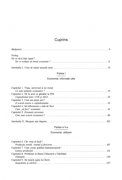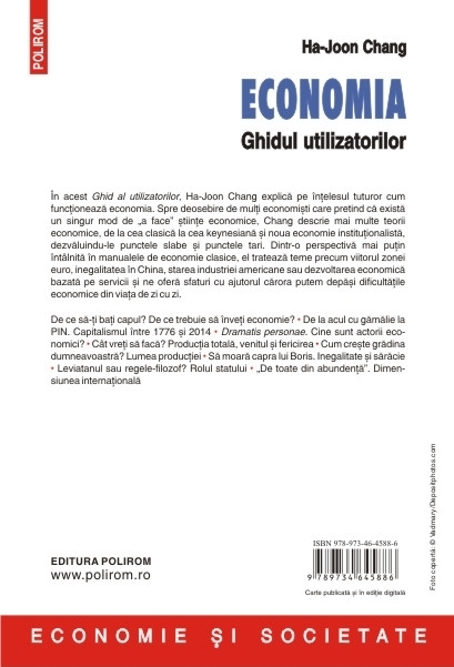 Traducere de Catalin Dracsineanu In acest Ghid al utilizatorilor, Ha-Joon Chang explica pe intelesul tuturor cum functioneaza economia. Spre deosebire de multi economisti care pretind ca exista un singur mod de „a face” stiinte economice, Chang descrie mai multe teorii economice, de la cea clasica la cea keynesiana si noua economie institutionalista, dezvaluindu-le punctele slabe si punctele tari. Dintr-o perspectiva mai putin intilnita in manualele de economie clasice, el trateaza teme precum viitorul zonei euro, inegalitatea in China, starea industriei americane sau dezvoltarea economica bazata pe servicii si ne ofera sfaturi cu ajutorul carora putem depasi dificultatile economice din viata de zi cu zi. Din cuprins: De ce sa-ti bati capul? De ce trebuie sa inveti economie? • De la acul cu gamalie la PIN. Capitalismul intre 1776 si 2014 • Dramatis personae. Cine sint actorii economici? • Cit vreti sa faca? Productia totala, venitul si fericirea • Cum creste gradina dumneavoastra? Lumea productiei • Sa moara capra lui Boris. Inegalitate si saracie • Leviatanul sau regele-filozof? Rolul statului • „De toate din abundenta”. Dimensiunea internationala
