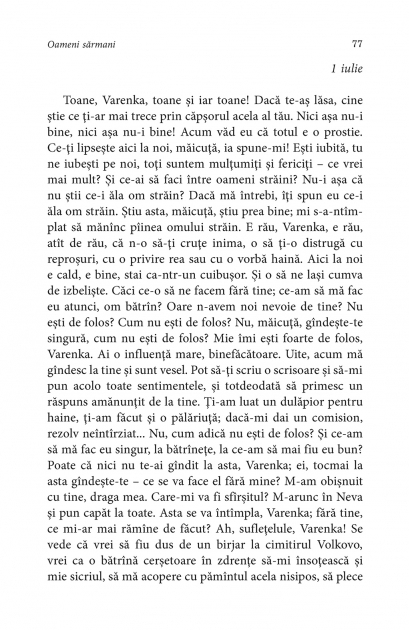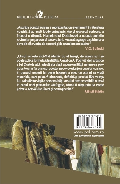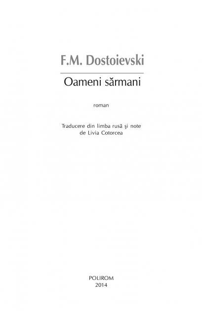 Traducere din limba rusa si note de Livia Cotorcea Volumul de debut al lui F.M. Dostoievski, Oameni sarmani, aparut in 1846, este o carte antologica, marcind o mutatie radicala: dupa el literatura lumii nu va mai fi la fel. Complexitatea si profunzimea acestui roman epistolar il fac sa-si pastreze si astazi capacitatea de a fascina. Considerat „primul roman social” din literatura rusa, Oameni sarmani este o satira a epocii, moravurilor si chiar a literaturii timpului. In centrul povestii se afla inocenta si trista afectiune dintre un functionar de rangul cel mai umil, Makar Devuskin, si verisoara sa indepartata, tinara orfana Varvara Dobroselova. Cei doi traiesc intr-o saracie lucie si se lupta sa supravietuiasca de la o zi la alta, cu speranta unei minuni improbabile. Schimbul de scrisori dintre cei doi dezvaluie, pas cu pas, o intreaga lume, cu framintarile ei, prinsa in lupta pentru supravietuire. Tema gogoliana a omului marunt, a slujbasului umil, e revalorizata constient de Dostoievski, facind din Makar Devuskin unul dintre personajele memorabile ale literaturii universale. „Aparitia acestui roman a reprezentat un eveniment in literatura noastra. S-au auzit laude entuziaste, dar si reprosuri serioase, a inceput o disputa. Numele dlui Dostoievski a ocupat paginile revistelor pe parcursul citorva luni. Aceasta agitatie a spiritelor a dovedit ca e vorba de o opera si de un talent deosebite.” (V.G. Belinski) „Omul nu este nicicind identic cu el insusi, de aceea nu i se poate aplica formula identitatii: A egal cu A. Potrivit ideii artistice a lui Dostoievski, adevarata viata a personalitatii umane se produce tocmai in punctul acestei neconcordante a omului cu sine, in punctul trecerii lui peste hotarele a ceea ce este el ca viata materiala, care poate fi observata, definita si prezisa fara vointa lui. Adevarata viata a personalitatii omului este accesibila numai in cazul unei patrunderi dialogale, careia ii raspunde ea insasi printr-o dezvaluire libera si nestingherita.” (Mihail Bahtin)