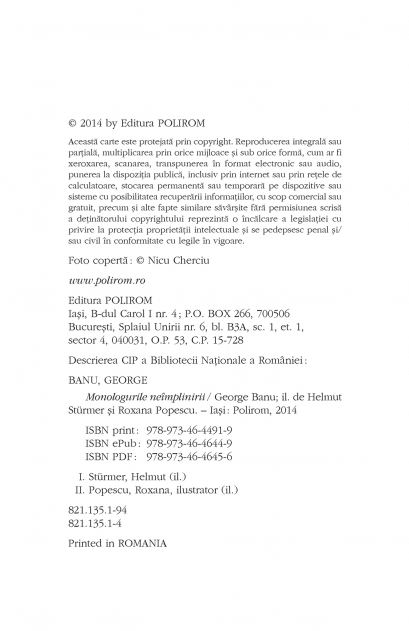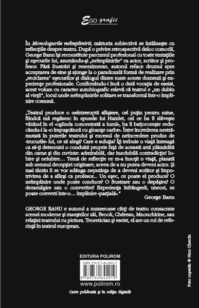 Desene de Helmut Stürmer si Roxana Popescu In Monologurile neimplinirii, marturia subiectiva se intilneste cu reflectiile despre teatru. Dupa o privire retrospectiva deloc comoda, George Banu isi reconstituie parcursul profesional cu toate tentatiile si esecurile lui, asumindu-si „neimplinirile” ca actor, scriitor si profesor. Fara frustrari si resentimente, autorul reface drumul spre acceptarea de sine si ajunge la o paradoxala forma de realizare prin „reciclarea” esecurilor si dialogul dintre toate aceste domenii si experiente profesionale. Confirmindu-i inca o data vocatia de eseist, acest volum cu caracter autobiografic releva ca teatrul e „un dublu al vietii”, locul unde neimplinirile solitare se transforma intr-o implinire comuna. „Teatrul produce o neintrerupta sfisiere, cel putin pentru mine, fiindca ma regasesc in spusele lui Hamlet, cel ce ba il slaveste vazind in el «oglinda concentrata a lumii», ba il batjocoreste reducindu-l la «o impuscatura cu gloante oarbe». Intre increderea nestramutata in puterile teatrului si excesul de neincredere produs de «trucurile» lui, ce sa alegi? Care e solutia? Iti trebuie o viata intreaga ca sa-ti determini o conduita proprie fata de aceasta arta plamadita din carne si din cuvinte: admirabila, dar insolubila contradictie! Iubire si neiubire… Tema de reflectie ce m-a insotit o viata, plasata sub semnul deceptiei originare, aceea de a nu putea deveni actor. Si mai tirziu li se vor adauga neputinta de a deveni scriitor si impotrivirea de a sfirsi ca profesor... Un esec, ce poate el produce? O neimplinire unde poate conduce? O frustrare sau o depasire? O dezamagire sau o convertire? Experienta infringerii, uneori, se poate converti intr-o… implinire «partiala».” (George Banu) George Banu e autorul a numeroase carti de teatru consacrate scenei moderne si maestrilor sai, Brook, Chereau, Mnouchkine, sau relatiei teatrului cu pictura. Teoretician si eseist, el are un rol de referinta in teatrul european.