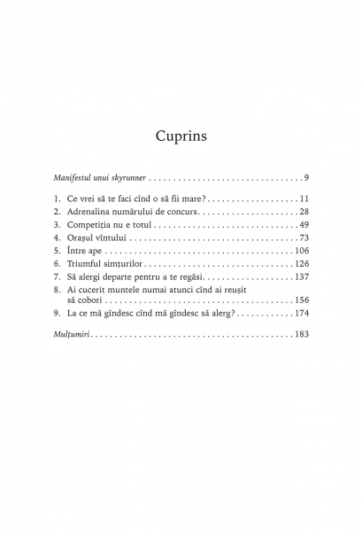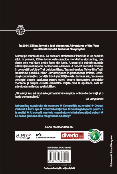 A urcat pe munte de mic. La zece ani strabatuse Pirineii de la un capat la altul. In prezent, Kilian Jornet este campion mondial la skyrunning, una dintre cele mai dure probe fizice din lume. A urcat si a coborit muntele Kilimanjaro mai repede decit oricine altcineva. A doborit recordul mondial in competitii ca Ultra-Trail du Mont-Blanc, Transpirenaica, Tahoe Rim Trail. Redefinind posibilul, Kilian Jornet forteaza in permanenta limitele, uimindu-si concurentii cu conditia fizica si abilitatile sale. Jurnalul sau, in care ne vorbeste despre pasiunea pentru sport, despre frumusetea peisajelor montane si despre cursele dramatice fortate pina la epuizare, este un adevarat manifest al spiritului liber.