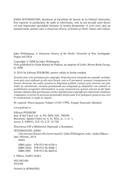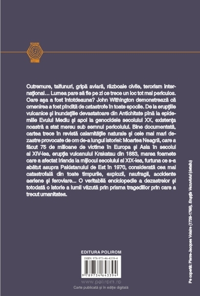 Traducere de Andra Hancu Cutremure, taifunuri, gripa aviara, razboaie civile, terorism international… Lumea pare sa fie pe zi ce trece un loc tot mai periculos. Oare asa a fost intotdeauna? John Withington demonstreaza ca omenirea a fost pindita de catastrofe in toate epocile. De la eruptiile vulcanice si inundatiile devastatoare din Antichitate pina la epidemiile Evului Mediu si apoi la genocidele secolului XX, existenta noastra a stat mereu sub semnul pericolului. Bine documentata, cartea trece in revista calamitatile naturale si cele mai mari dezastre provocate de om de-a lungul istoriei: Moartea Neagra, care a facut 75 de milioane de victime in Europa si Asia in secolul al XIV-lea, eruptia vulcanului Krakatau din 1883, marea foamete care a afectat Irlanda la mijlocul secolului al XIX-lea, furtuna ce s-a abatut asupra Pakistanului de Est in 1970, considerata cea mai catastrofala din toate timpurile, explozii, naufragii, accidente aeriene si feroviare... O veritabila enciclopedie a dezastrelor si totodata o istorie a lumii vazuta prin prisma tragediilor prin care a trecut umanitatea. Din cuprins: Eruptii vulcanice • Cutremure • Inundatii • Uragane • Razboaie si invazii • Epidemii • Incendii • Accidente aviatice