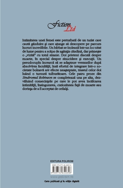 Intimitatea unei femei este perturbata de un turist care cauta gazduire si care ajunge sa descopere pe parcurs lucruri incredibile. Un barbat se izoleaza intr-un loc uitat de lume pentru a scapa de agitatia citadina, dar primeste o „vizita” cu totul stranie. Doi prieteni discuta despre moarte, in special despre sinucidere si executii. Un pseudocuplu incearca sa se adapteze vremurilor dupa absolvirea facultatii, insa efortul de integrare intr-o societate bolnava are efecte neasteptate, traseul celor doi luind o turnura tulburatoare. Cele patru proze din Sindromul Robinson se completeaza una pe alta, dezvaluind consecintele pe care le pot avea incalcarea intimitatii, insingurarea, curiozitatea fata de moarte sau dorinta de a fi acceptat de ceilalti.