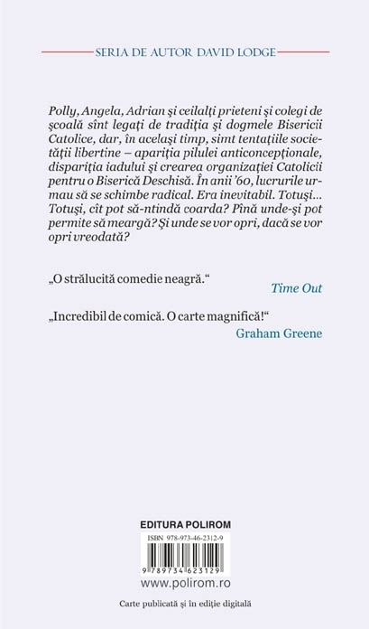 Editia a II-a Traducere din limba engleza si notede Radu Pavel Gheo Polly, Dennis, Angela si Adrian impreuna cu ceilalti prieteni si colegi de scoala sint legati de traditie si de dogmele Bisericii Catolice, dar, in acelasi timp, simt tentatiile societatii libertine – aparitia pilulei anticonceptionale, disparitia iadului si crearea organizatiei Catolici pentru o Biserica Deschisa. In anii ’60, lucrurile urmau sa se schimbe radical. Era inevitabil. Totusi... Totusi, cit pot sa‑ntinda coarda? Pina unde isi pot permite sa mearga? Si unde se vor opri, daca se vor opri vreodata? „O stralucita comedie neagra.” (Time Out) „Incredibil de comica. O carte magnifica!” (Graham Greene)