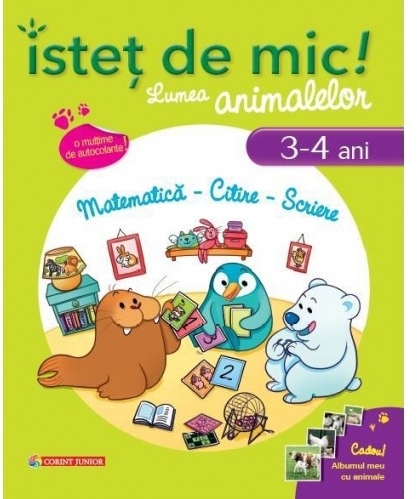 Corint Junior readuce în atenția dumneavostră seria Isteț de mic! De această dată, este vorba despre o carte creată special pentru pregătirea preșcolarului (copii de 3-4 ani): Isteț de mic! Lumea animalelor. • Noţiunile de bază explicate prin ilustraţii • Activităţi simple şi variate pentru a exersa prin joc aceste noţiuni • Tema animalelor, care îi pasionează pe cei mici • Numeroase autocolante pentru a anima activităţile • Autocolante cu diverse animale şi puii lor pentru albumul de la finalul caietului