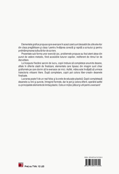 Elementele grafice propuse spre exersare în acest caiet sunt deosebit de utile elevilor din clasa pregătitoare și clasa I pentru învățarea corectă și rapidă a scrisului și pentru preîntâmpinarea tulburărilor de scriere. Prezentate sub forma unor exerciții-joc, problemele propuse au fost atent alese din punct de vedere metodic, fiind accesibile tuturor copiilor, indiferent de ritmul lor de dezvoltare. La începutul fiecărei sarcini de lucru, copiii trebuie să completeze anumite desene, aflate în diferite stadii de finalizare; elementele care lipsesc din imagini sunt chiar grafismele pe care dorim să le exerseze cei mici. Astfel, mana este învățată să urmeze traiectoria viitoarei litere. După completare, copiii pot colora liber-creativ desenele finalizate. Lucrarea poate fi de un real folos și la orele de educație plastică. Copiii completează desenele cu linii și puncte, întregind formele, dar le pot și colora diferit, operând astfel cu principalele elemente de limbaj plastic. Este un mijloc plăcut și util pentru exersare!