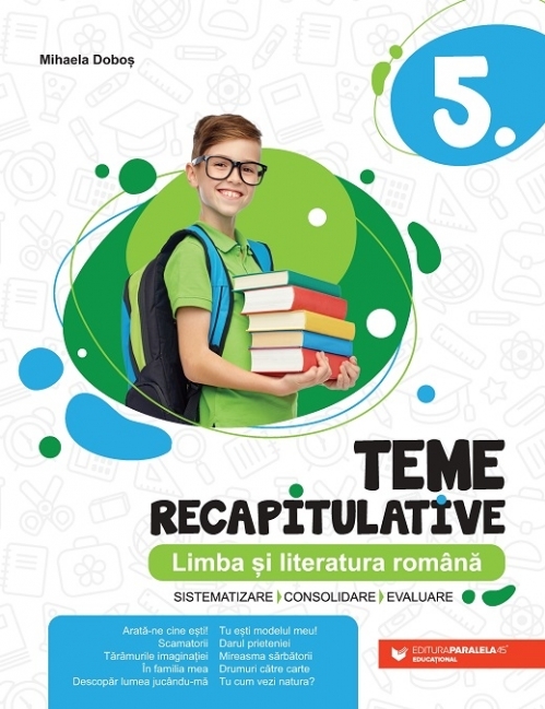 Volumul consacrat clasei a V-a din seria de auxiliare intitulată Teme recapitulative dezvoltă zece teme derivate din tema generală prevăzută de programa școlară („Eu și universul meu familiar”), după cum urmează: Arată-ne cine ești!, Scamatorii, Tărâmurile imaginației, În familia mea, Descopăr lumea jucându-mă, Tu ești modelul meu!, Darul prieteniei, Mireasma sărbătorii, Drumuri către carte, Tu cum vezi natura?