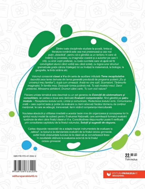 Noutatea absolută și utilitatea imediată a acestor teste vine din organizarea și conceperea lor în spiritul noului model de subiect pentru Evaluarea Națională, care asimilează formatul evaluării susținute de elevi către finalul clasei a VI-a. Corectitudinea răspunsurilor poate fi verificată prin consultarea capitolului de la finalul volumului, Soluții și sugestii de răspuns.