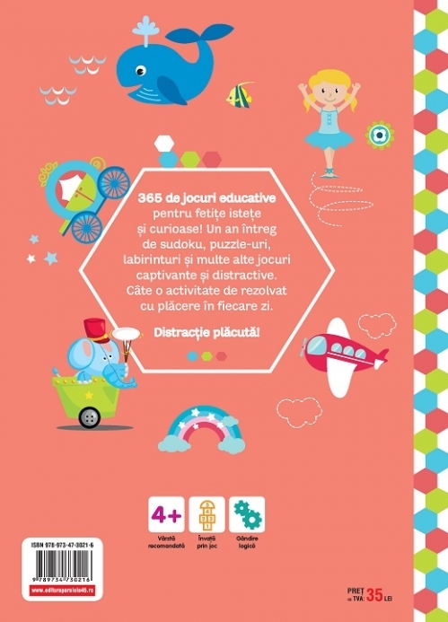365 de jocuri educative pentru fetițe istețe și curioase! Un an întreg de sudoku, puzzle-uri, labirinturi și multe alte jocuri captivante și distractive. Câte o activitate de rezolvat cu plăcere în fiecare zi. Distracție plăcută!