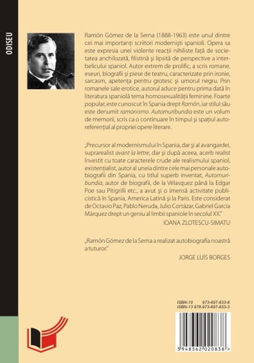Ramon Gomez de la Serna (1888 – 1963) este unul dintre cei mai importanţi scriitori modernişti spanioli. Opera sa este expresia unei violente reacţii nihiliste faţă de societatea anchilozată, filistină şi lipsită de perspective a interbelicului spaniol. Autor extrem de prolific, a scris romane, eseuri, biografii şi piese de teatru, caracterizate prin ironie, sarcasm, apetenţă pentru grotesc şi umorul negru. Prin romanele sale erotice, autorul aduce pentru prima dată în literatura spaniolă tema homosexualităţii feminine. Foarte popular, este cunoscut în Spania drept Ramon, iar stilul său este denumit ramonismo. Automuribundia este un volum de memorii, scris ca o continuare în timpul şi spaţiul autoreferenţial al propriei opere literare.