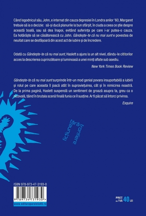 Gândește-te că nu mai sunt surprinde într-un mod genial povara insuportabilă a iubirii și rolul pe care aceasta îl joacă atât în supraviețuirea, cât și în nimicirea noastră. De la prima pagină, Haslett suspendă un sentiment de groază asupra ta, greu ca o nicovală, tăind în brutala scenă finală funia ce îl susține. Ar fi păcat să întorci privirea.