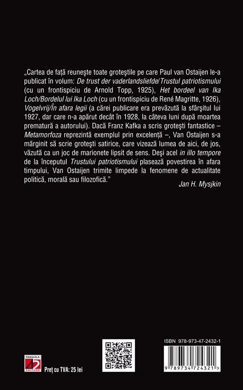 „Cartea de faţă reuneşte toate groteştile pe care Paul van Ostaijen le-a publicat în volum: De trust der vaderlandsliefde/Trustul patriotismului (cu un frontispiciu de Arnold Topp, 1925), Het bordeel van Ika Loch/Bordelul lui Ika Loch (cu un frontispiciu de René Magritte, 1926), Vogelvrij/În afara legii (a cărei publicare era prevăzută la sfârşitul lui 1927, dar care n-a apărut decât în 1928, la câteva luni după moartea prematură a autorului). Dacă Franz Kafka a scris groteşti fantastice – Metamorfoza reprezintă exemplul prin excelenţă –, Van Ostaijen s-a mărginit să scrie groteşti satirice, care vizează lumea de aici, de jos, văzută ca un joc de marionete lipsit de sens. Deşi acel in illo tempore de la începutul Trustului patriotismului plasează povestirea în afara timpului, Van Ostaijen trimite limpede la fenomene de actualitate politică, morală sau filozofică.”