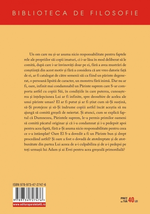 Un om care nu și-ar asuma nicio responsabilitate pentru faptele rele ale propriilor săi copii imaturi ci i-ar lăsa în mod deliberat să le comită, după care i-ar învinovăți doar pe ei, fără a avea mustrări de conștiinţă din acest motiv și fără a considera că are vreo datorie faţă de ei, ar fi catalogat de către semenii săi ca fiind un părinte degenerat, o persoană lipsită de caracter, un monstru fără inimă. Dar nu ar fi, oare, infinit mai condamnabil un Părinte suprem care S-ar comporta astfel cu copiii Săi, în condiţiile în care puterea, cunoașterea și Înţelepciunea Lui ar fi infinite, spre deosebire de acelea ale unui părinte uman? El ar fi putut și ar fi știut cum să-Și susţină, să-Și protejeze și să-Și îndrume copiii astfel încât aceștia să nu ajungă să comită greșeli de neiertat. Și atunci, cum se explică faptul că Dumnezeu, Părintele suprem, le-a permis primilor oameni să comită păcatul originar și că i-a condamnat și i-a pedepsit apoi pentru acea faptă, fără a-Și asuma nicio resposabilitate pentru ceea ce s-a întâmplat? Oare El S-a dovedit a fi un Părinte bun și drept procedând astfel? Și oare a fost o dovadă de atotdreptate și de atotbunătate din partea Lui aceea de a-i culpabiliza și de a-i pedepsi pe toţi urmașii lui Adam și ai Evei pentru acea greșeală primordială?