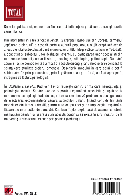 În Spălarea creierului, Kathleen Taylor reuneşte pentru prima oară neuroştiinţa şi psihologia socială. Servindu-se de o proză elegantă şi accesibilă şi apelând la numeroase exemple şi studii de caz, autoarea examinează problemele etice generate de efectuarea experimentelor asupra subiecţilor umani, ţinând cont de limitările modelelor din lumea animală, pentru a se ocupa apoi şi de implicaţiile înspăimântătoare ale unor astfel de cercetări. Kathleen Taylor explorează de asemenea istoria manipulării gândurilor şi arată cum aceasta continuă să existe în jurul nostru, de la marketing la televiziune, trecând prin politică şi educatie.