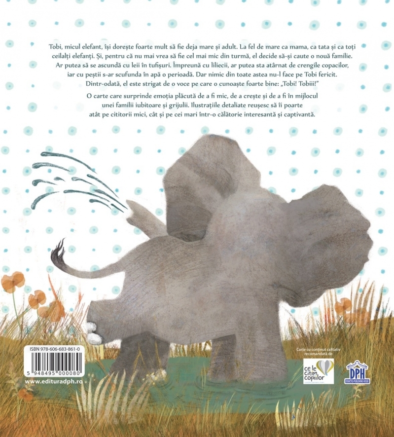 Tobi, micul elefant, își dorește foarte mult să fie deja mare și adult. La fel de mare ca mama, ca tata și ca toți ceilalți elefanți. Și, pentru că nu mai vrea să fie cel mai mic din turmă, el decide să-și caute o nouă familie.