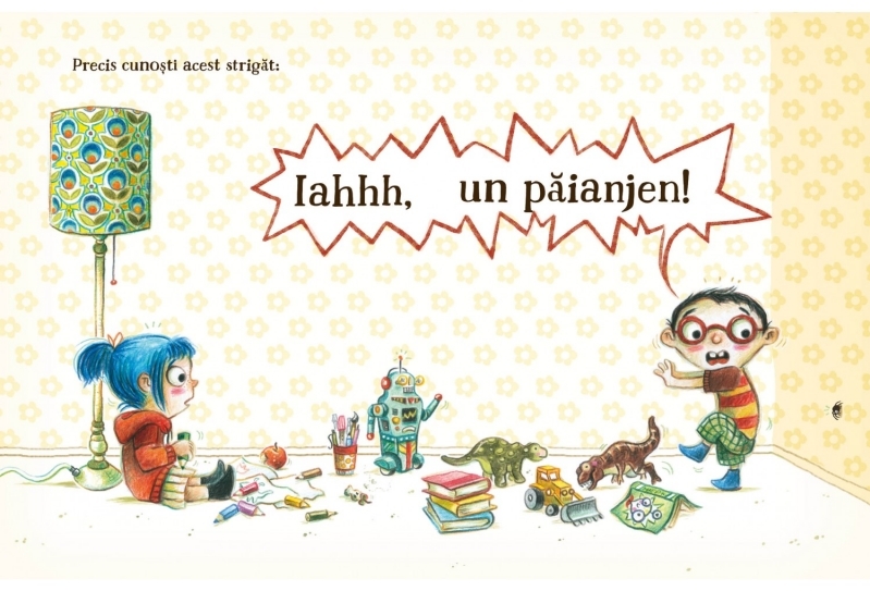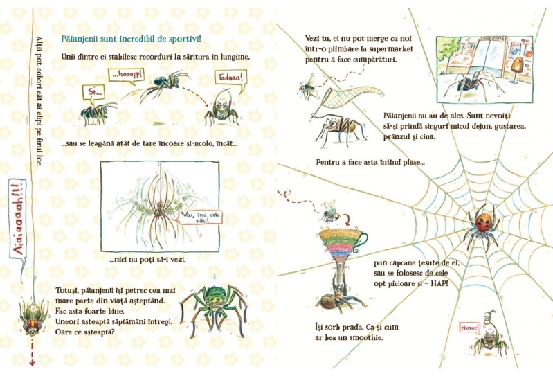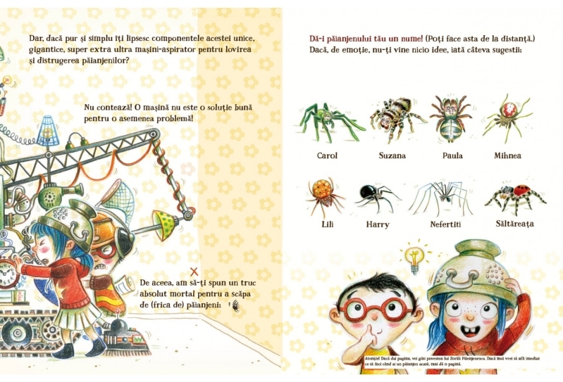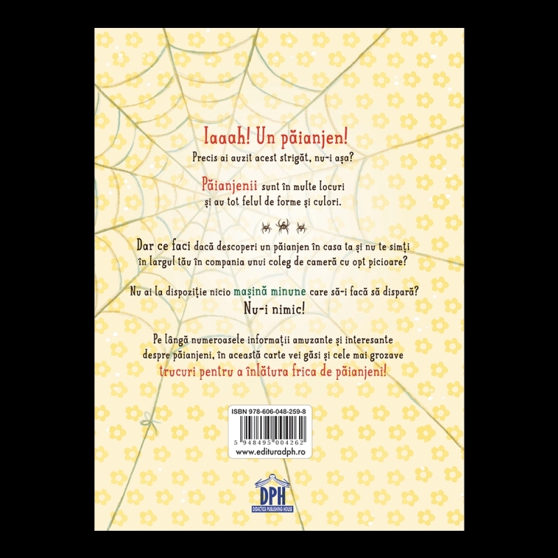 Dar ce faci dacă descoperi un păianjen în casa ta și nu te simți în largul tău în compania unui coleg de cameră cu opt picioare? Nu ai la dispoziție nicio mașină minune care să-i facă să dispară? Nu-i nimic! Pe lângă numeroasele informații amuzante și interesante despre păianjeni, în această carte vei găsi și cele mai grozave trucuri pentru a înlătura frica de păianjeni!