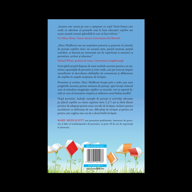 Povestitor și scriitor, Mary Medlicott începe prin a arăta care sunt pregătirile necesare pentru sesiunea de povești, apoi învață cititorul cum să stimuleze imaginația copiilor cu recuzită, voci și expresii faciale și cum să încurajeze empatia și utilizarea unui limbaj sensibil.