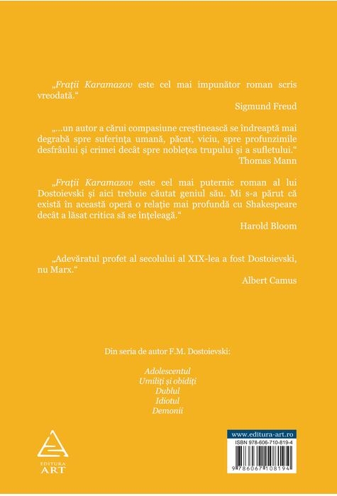 '"Frații Karamazov este cel mai puternic roman al lui Dostoievski și aici trebuie căutat geniul său. Mi s-a părut că există în această operă o relație mai profundă cu Shakespeare decât a lăsat critica să se înțeleagă." Harold Bloom