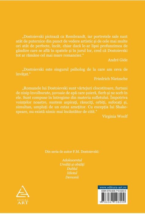 "Dostoievski pictează ca Rembrandt, iar portrelele sale sunt atât de puternice din punct de vedere artistic și de cele mai multe ori atât de perfecte, încât, chiar dacă le-ar lipsi profunzimea de gândire care se află în spatele și în jurul lor, cred că Dostoievski tot ar rămâne cel mai mare romancier.” André Gide